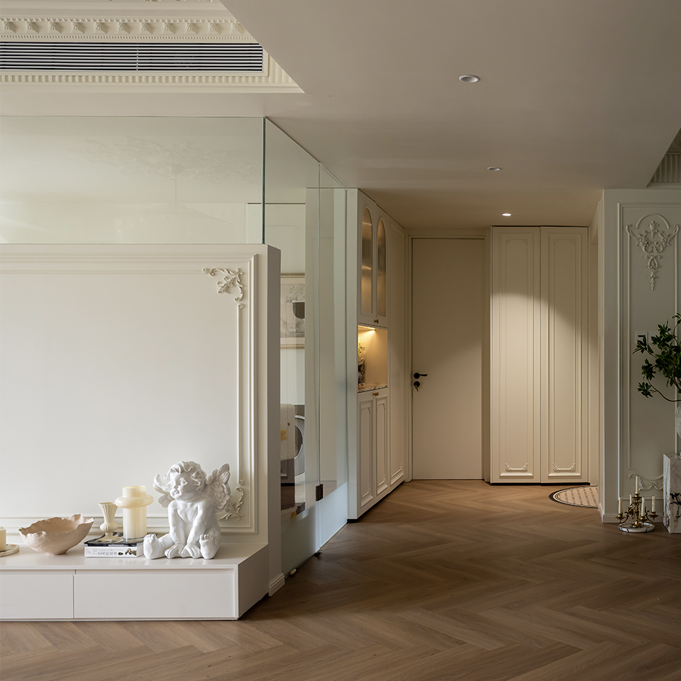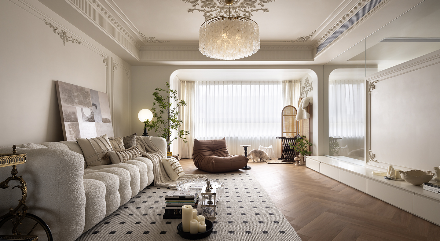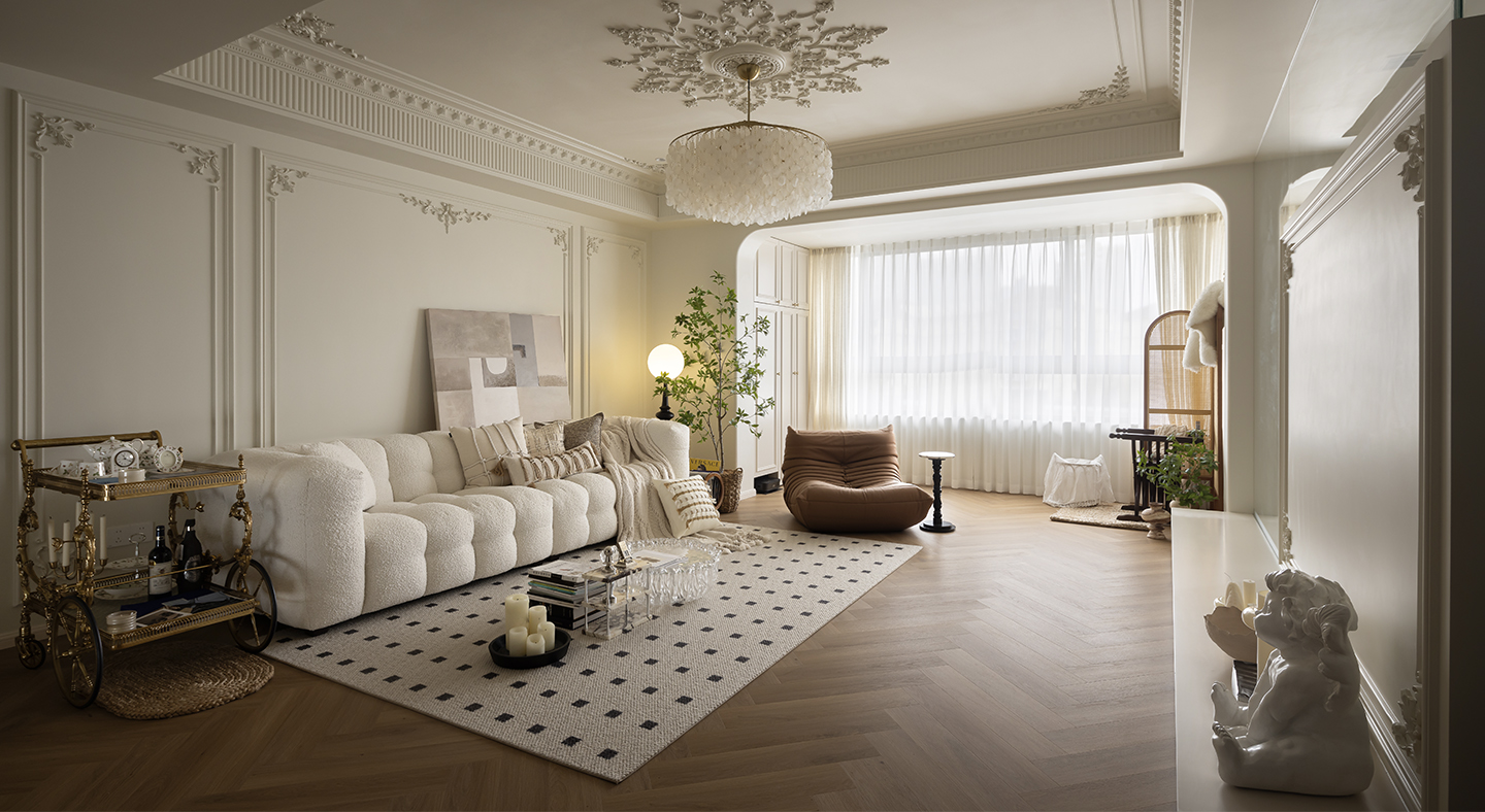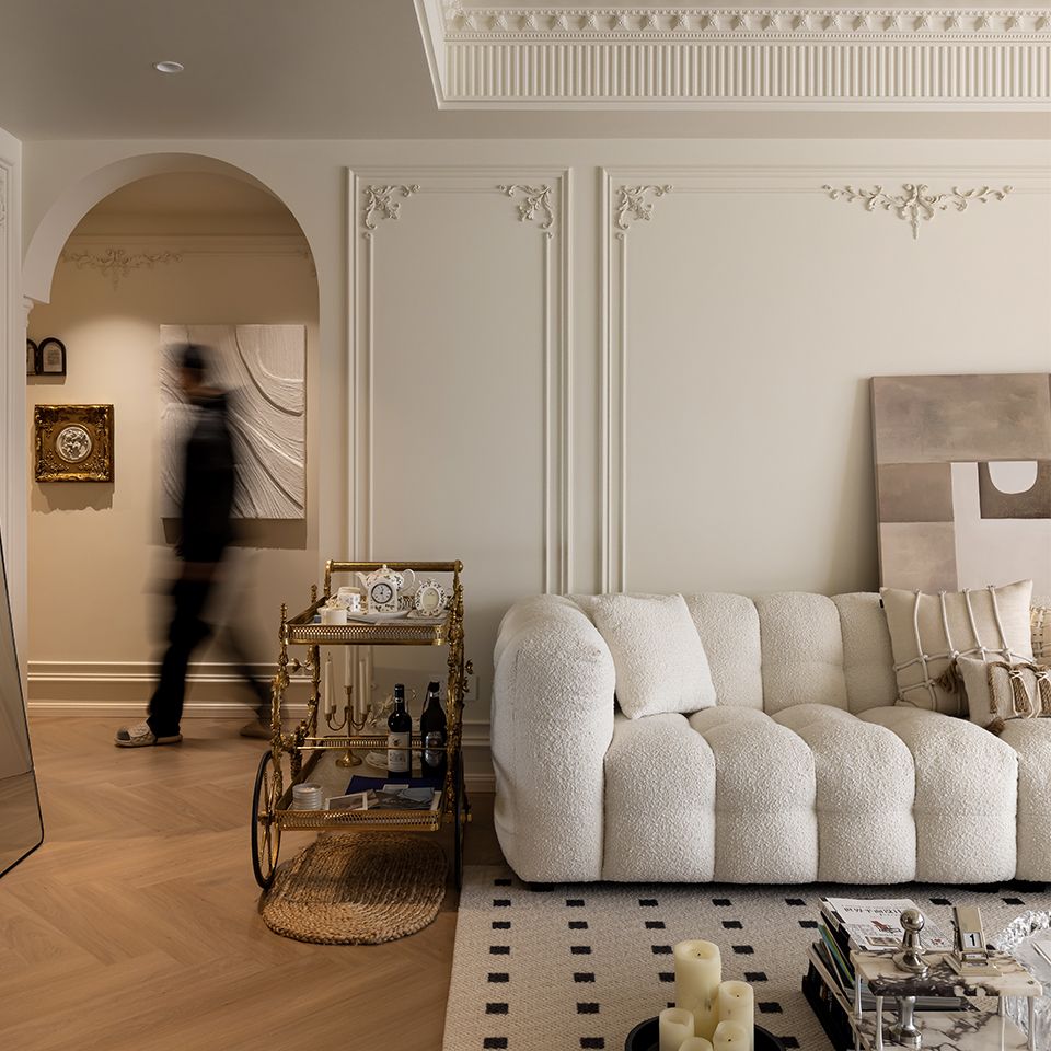 奶油色作为墙面基调,搭配法式精细的石膏线