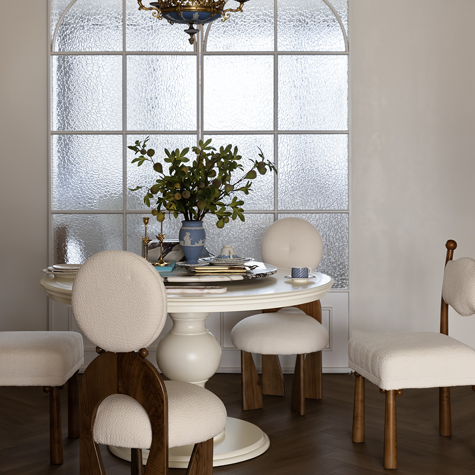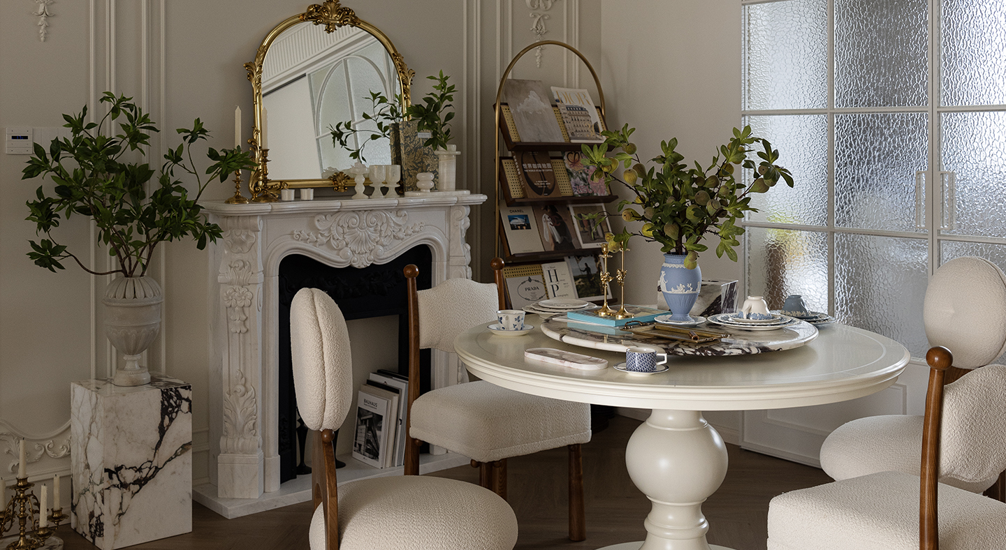 在餐厅摆放圆形餐桌,壁炉和餐边柜分别位于餐桌两侧