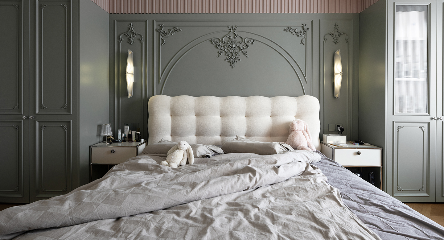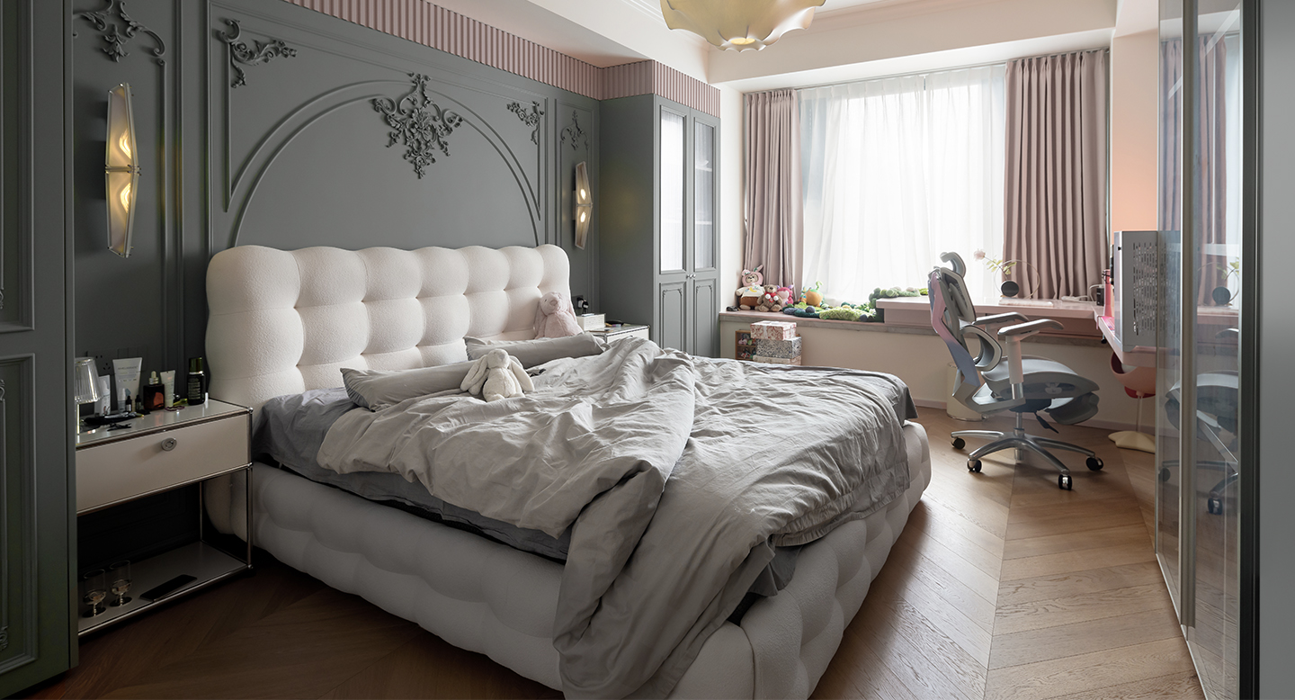 主卧中的墙体和柜体采用灰绿色与马卡龙粉