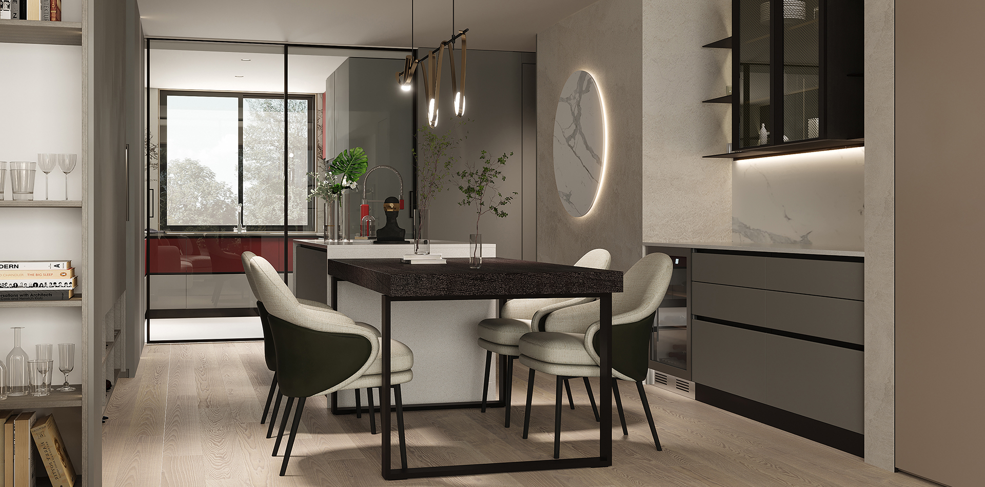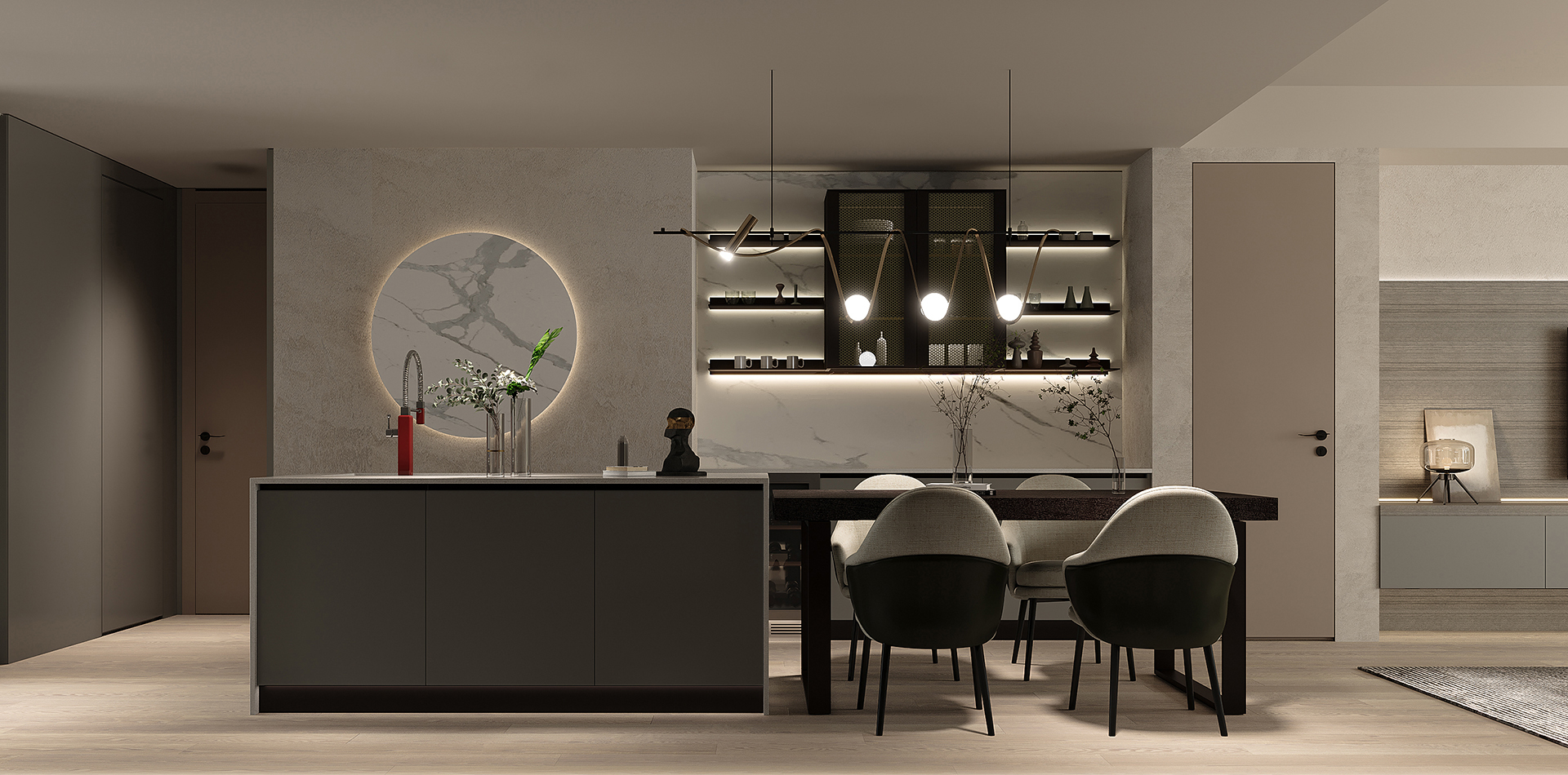 中巴岛台连着餐桌向客厅方向延伸